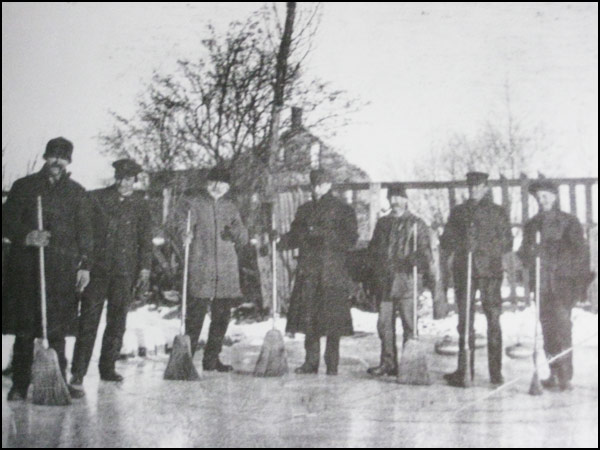 Curling on Rousseau Street. This outdoor rink was located on a marshy area across the road from where the first Wilson’s Mill was built. The curlers in this picture may be two rinks that were formed when the Ancaster Curling Club was formed in 1906. The minutes of the curling club are in possession of Fieldcote Museum along with the names of all the founding members (Courtesy Grimwood Collection).